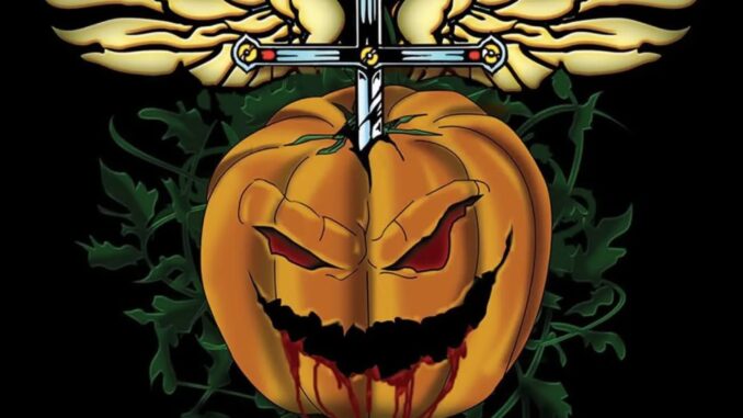 The new design reimagines one of rock’s most recognizable emblems — the Bon Jovi dagger and heart — but replaces the heart with a grinning pumpkin, its eyes glowing red with mischief and rebellion. Crimson drips from its jagged smile, adding a gothic flair that perfectly suits the season.